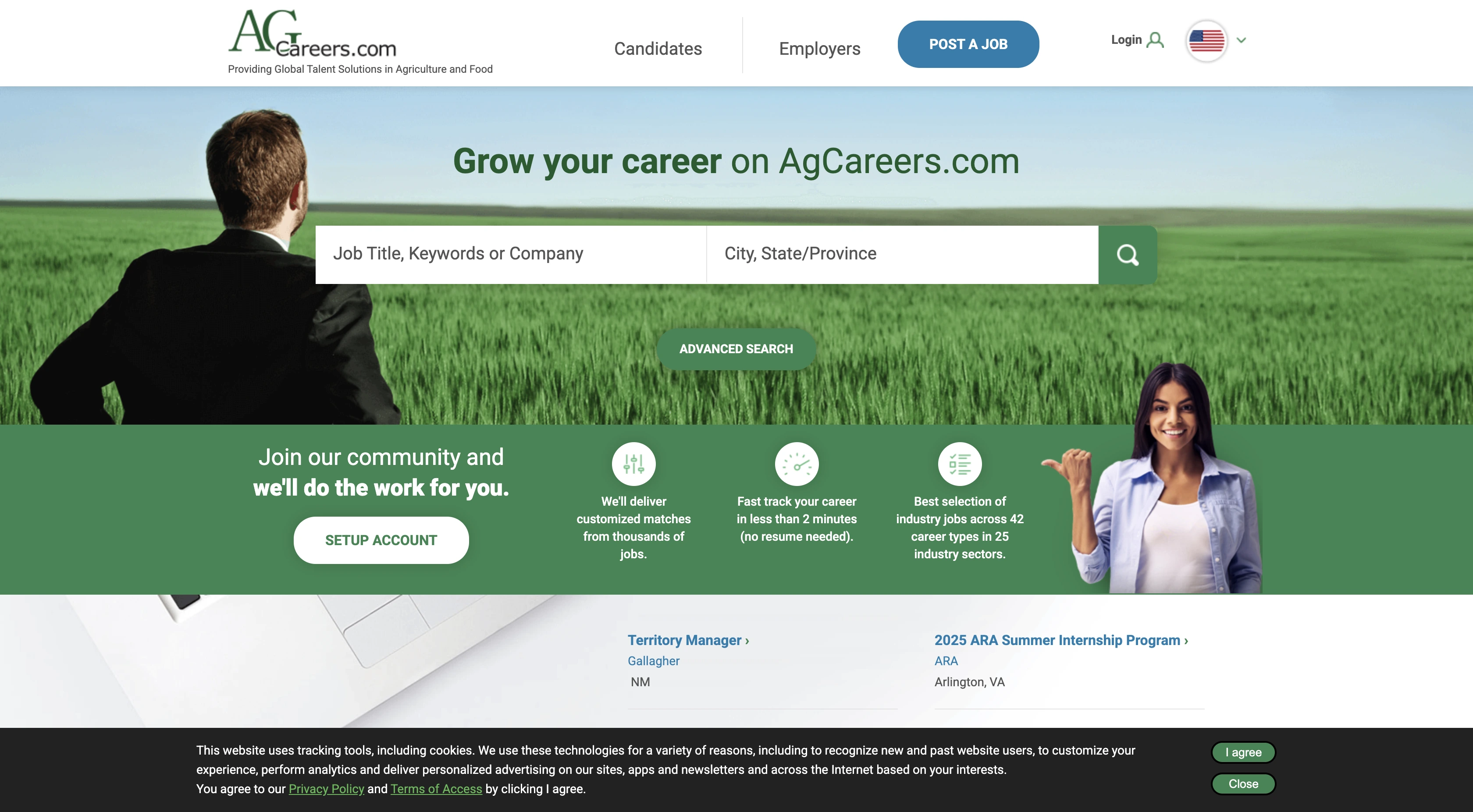 AgCareers is a leading job board in agriculture, food, biotechnology, and natural resources. It offers employers access to a global talent pool of professionals across diverse agricultural sectors. The platform also includes tools like resume searches, employer branding opportunities, and analytics to measure recruitment success. AgCareers partners with industry organizations to host career fairs and webinars, increasing visibility for job listings.
