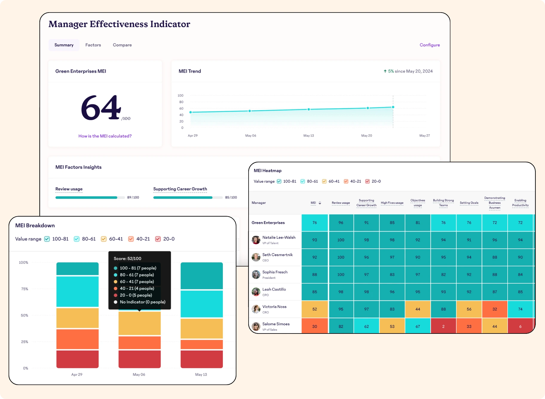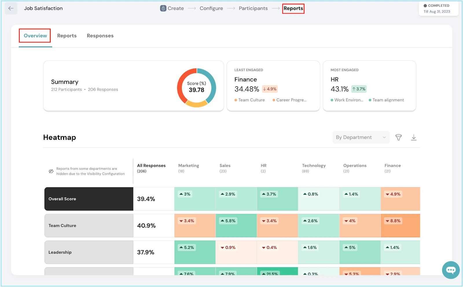 AI-driven surveys, sentiment analysis, and engagement heatmaps. Integrates with Workday and Slack, offering action plan templates.