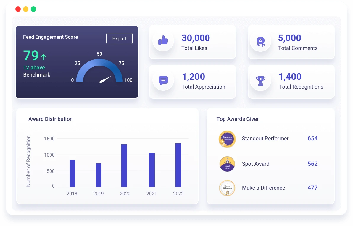 Features peer recognition, milestone celebrations, and engagement surveys. Integrates with Slack and HRIS, with real-time analytics.