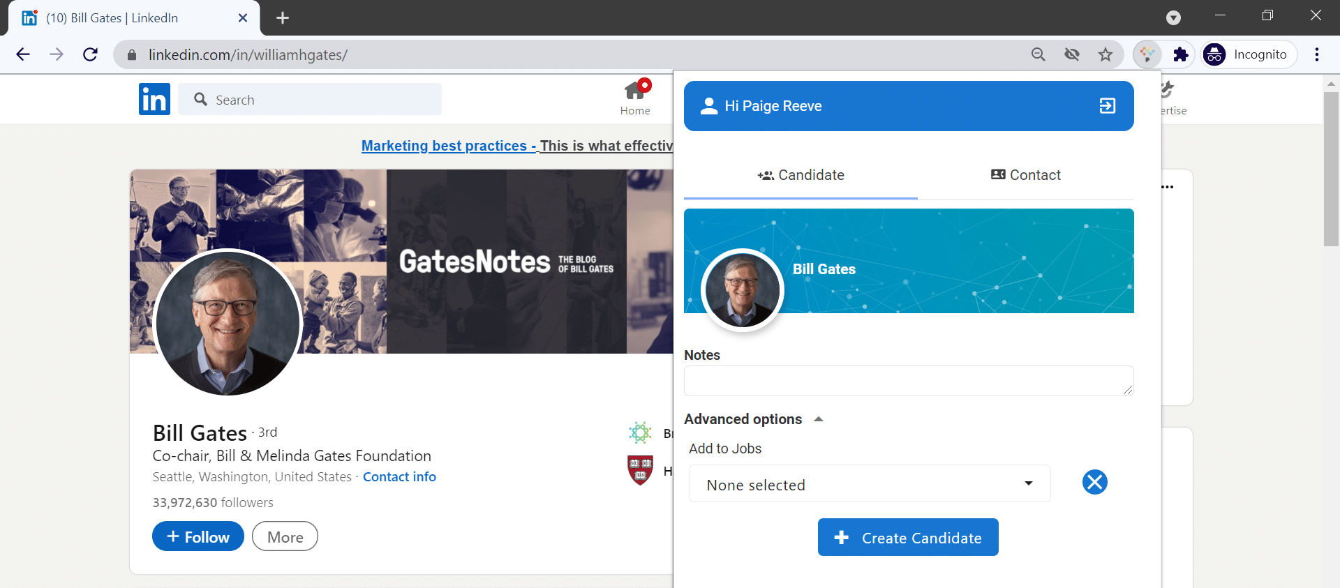 5. Create candidates, organizations, and contacts directly from LinkedIn with its LinkedIn Chrome extension. You just need to install the extension, log in with your Manatal credentials, and click on the extension icon when you visit a LinkedIn profile. The extension will automatically fill in the candidate’s information and let you add them to your database with one click. You can also use the extension to update existing candidates or create new ones from scratch.
