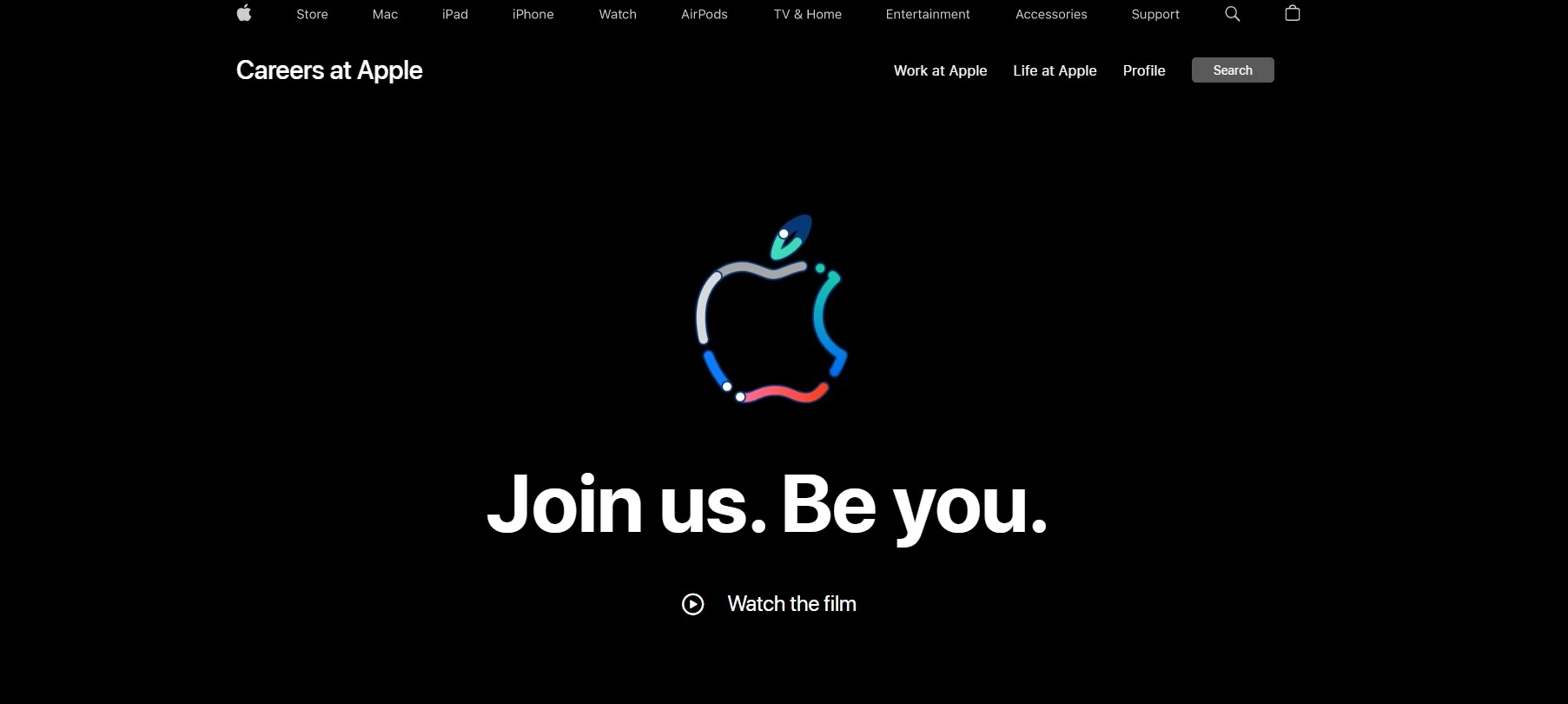 Apple offers another great careers page example. [6] The American multinational technology company begins its visitors’ journey with a unique advertisement, showing special motion graphics of its logo in different styles and designs to represent diversity.