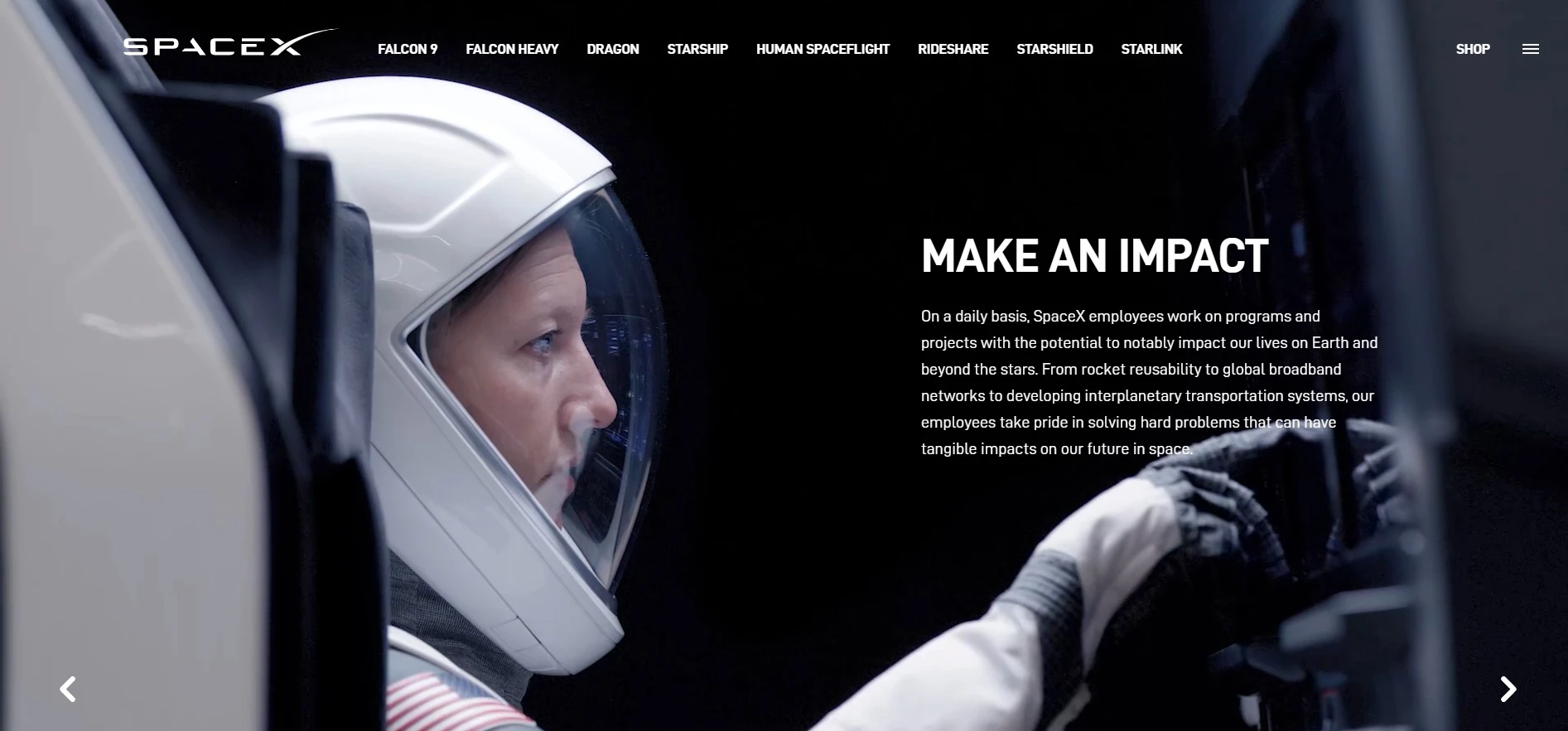 Under the job search option, visitors will be immediately led to the company’s mission and learn about the impact that SpaceX aims to leave on this planet. Then the site invites visitors to learn about what it's like being a part of the company before showcasing a video message from SpaceX’s President and COO, Gwynne Shotwell, explaining the company’s vision, values, and goals.