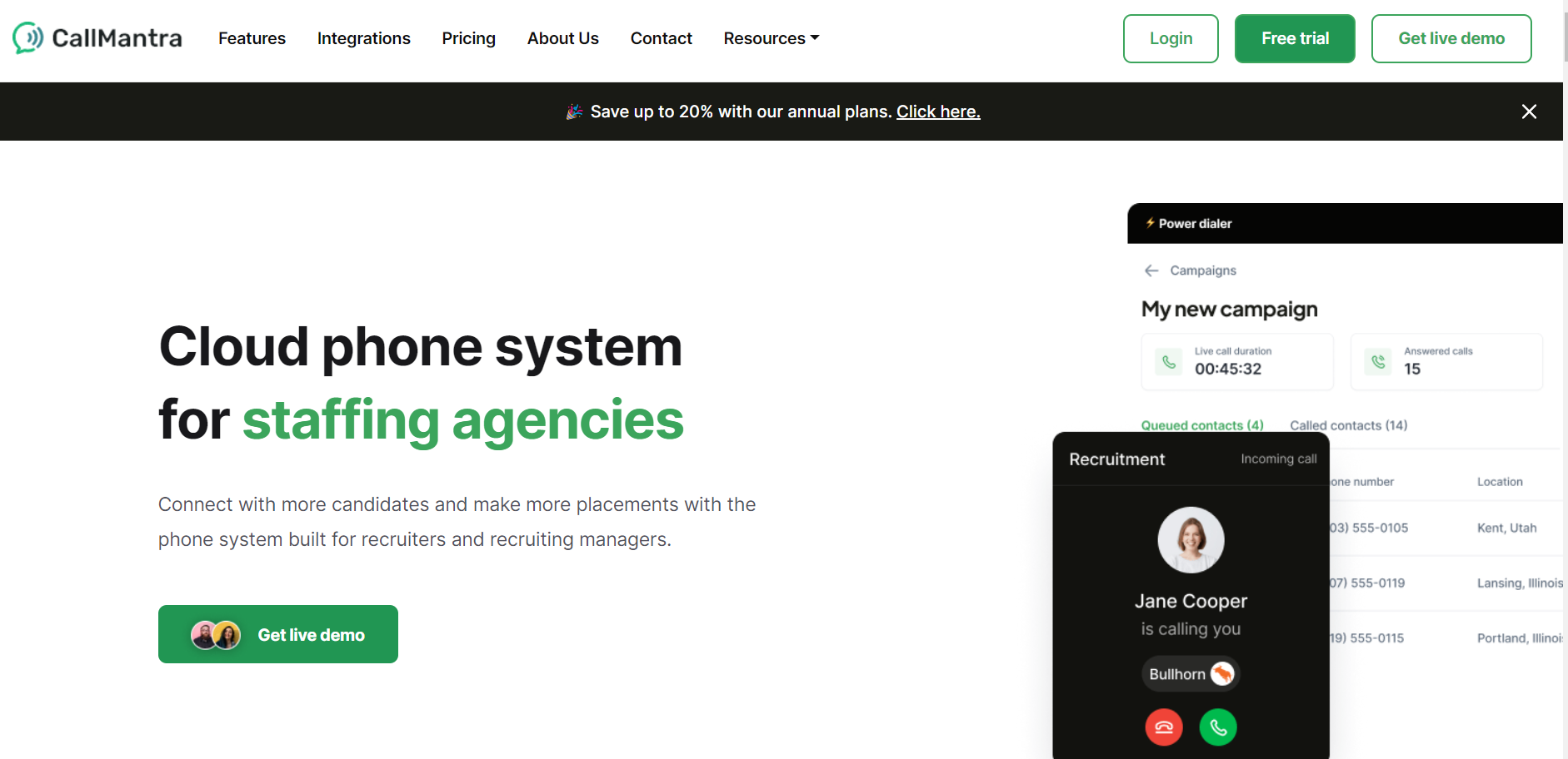 CallMantra is a cloud-based calling and texting software designed to help recruiters and hiring managers connect with more candidates and make more placements with the phone system.