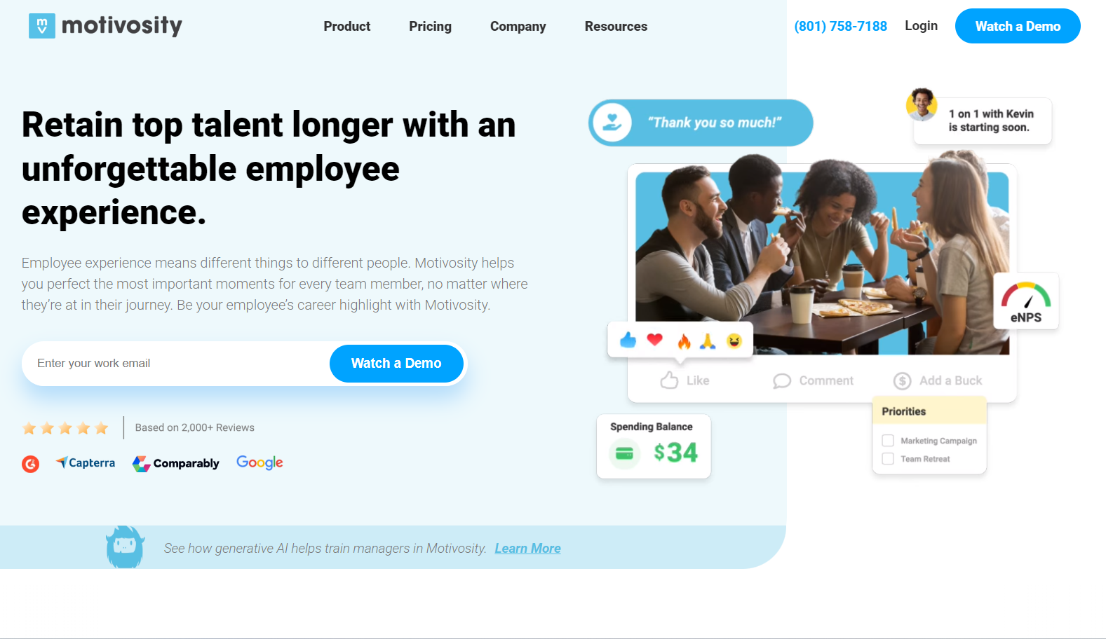 Motivosity is an employee engagement platform that focuses on fostering positive manager/employee engagement. Its features include recognition and rewards, goal setting, surveys, and feedback options. Motivosity is designed to help you perfect the most important moments for every team member, no matter where they’re at in their journey.