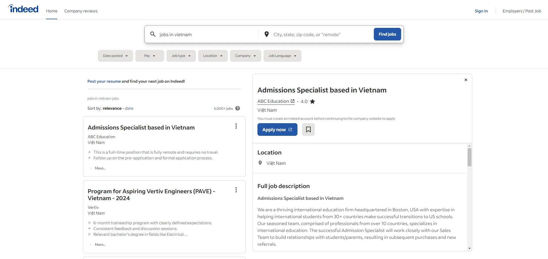 Indeed is a global job search engine that aggregates job listings from thousands of websites, including company career pages and job boards. In Vietnam, Indeed is widely used by both job seekers and recruiters. The platform offers powerful search capabilities and a large pool of candidates. Recruiters can post jobs directly on Indeed and take advantage of its sponsored job ads to increase visibility.