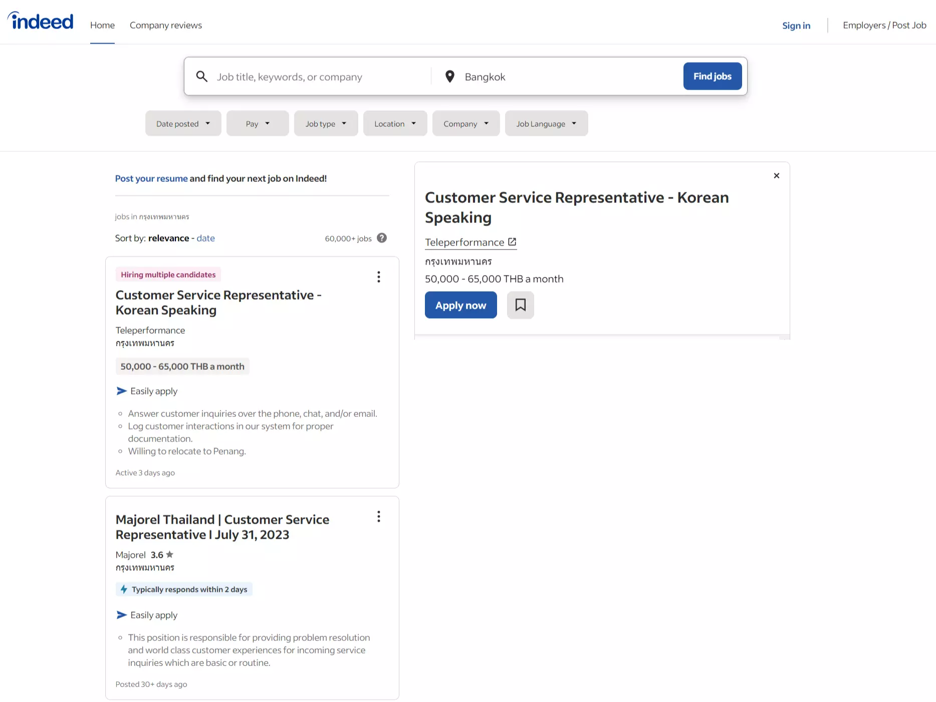- Indeed Thailand: Allows recruiters to post jobs for free, with the option to boost visibility through paid promotions.