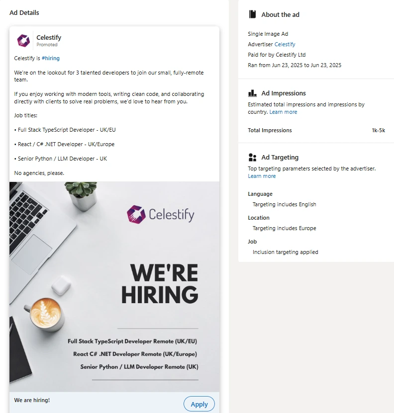 Celestify’s hiring ad communicates the availability of three remote technical roles within a small, fully distributed team, targeting candidates in the UK and EU. The language is straightforward and professional, focusing on the value of modern development practices and direct client collaboration. The roles are clearly listed, along with a preference for direct applicants (“No agencies, please”), which adds clarity around the hiring process. The ad uses minimalist design elements with clean branding and avoids excessive promotional language. However, it lacks deeper context, such as project domains, technologies beyond the stack keywords, or company culture insights, which may be relevant to experienced candidates considering startup or remote positions.