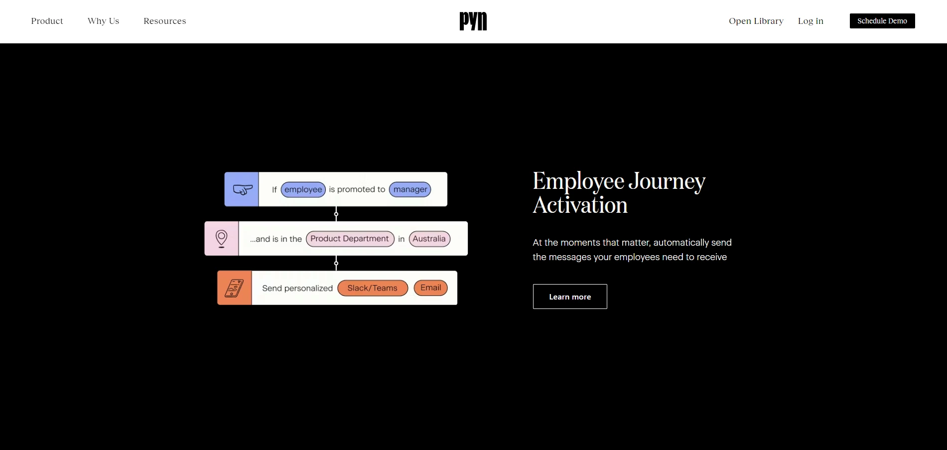 Communicating relevant messages at important moments like onboarding, promotions, and anniversaries is crucial. Pyn is a software designed to you automate and personalize this process. With data from your HR systems, it sends them in a timely manner, ensuring that all employees receive the right information when they need it. With a library of customizable templates, Pyn makes it easy to support your employees throughout their journey with your company. It’s more than just communication; it’s about creating a connected and engaged workforce.