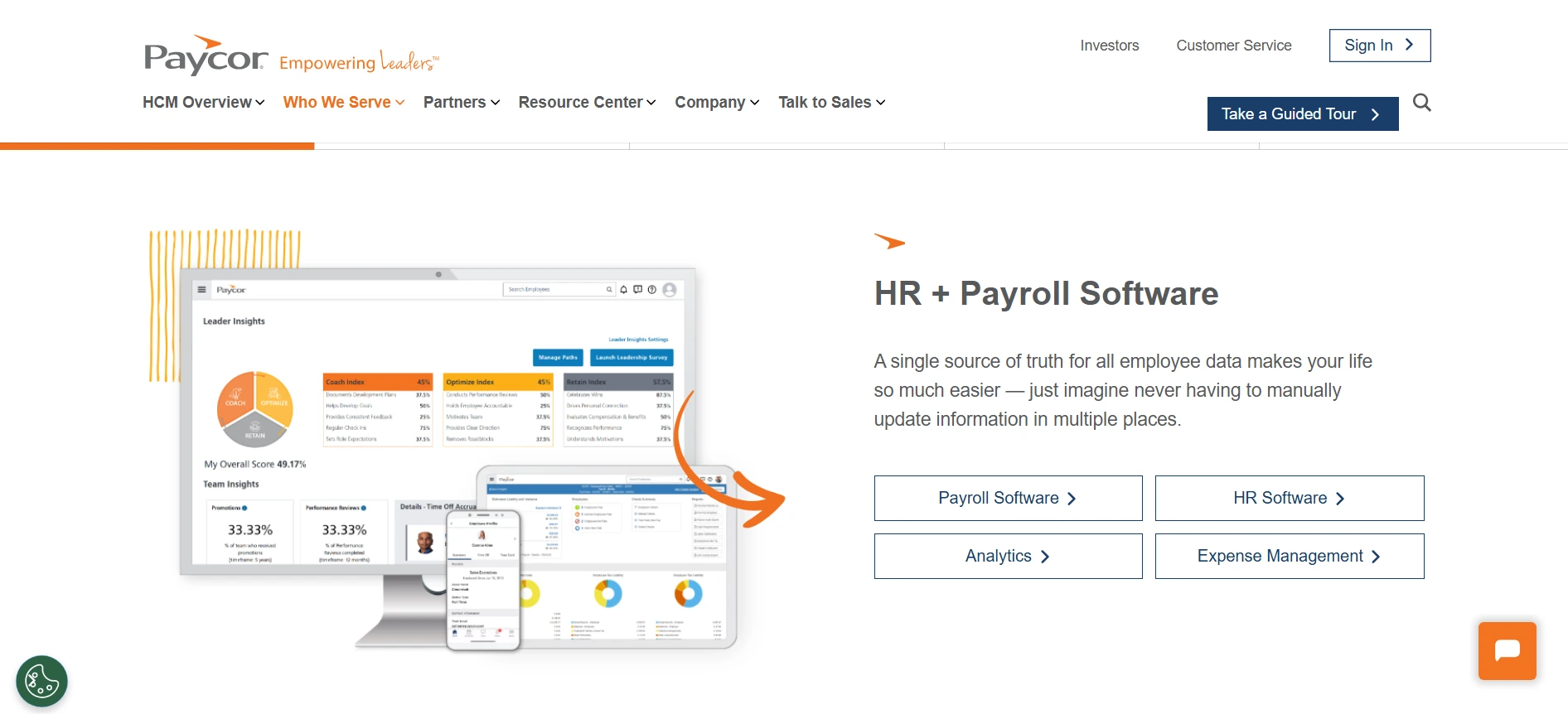 Paycor is a comprehensive Human Capital Management (HCM) solution that offers payroll, HR, time and attendance, and benefits administration. It is designed for small and mid-sized businesses to streamline their HR processes and ensure compliance with ease. Its key features are automated payroll processing, employee self-service, tax compliance, onboarding, performance management, and reporting tools.