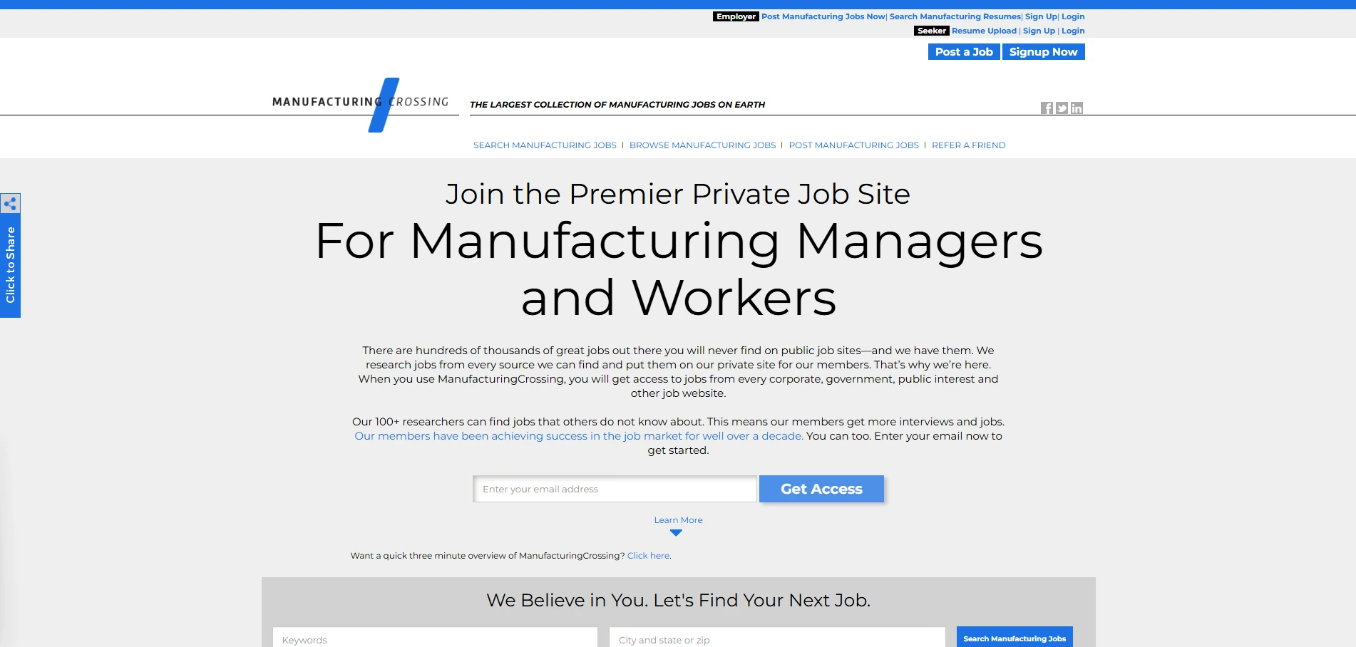 ManufacturingCrossing is a job board dedicated exclusively to manufacturing positions. The platform features a curated list of manufacturing jobs in various sub-industries, including automotive, electronics, aerospace, and more. It ensures quality over quantity by providing access to a highly skilled and targeted pool of candidates, making it an excellent choice for recruiters looking for experienced professionals in specialized roles such as CNC machinists or quality control inspectors.