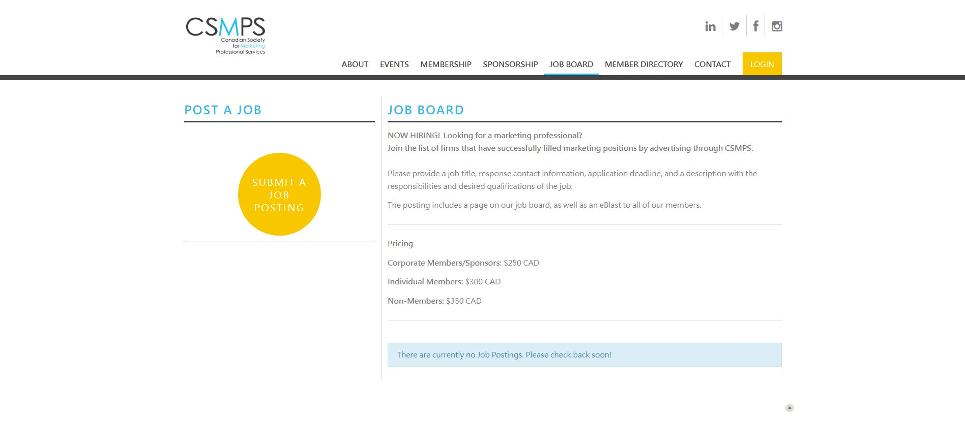 - Job postings for non-members: C$199.00 plus GST.