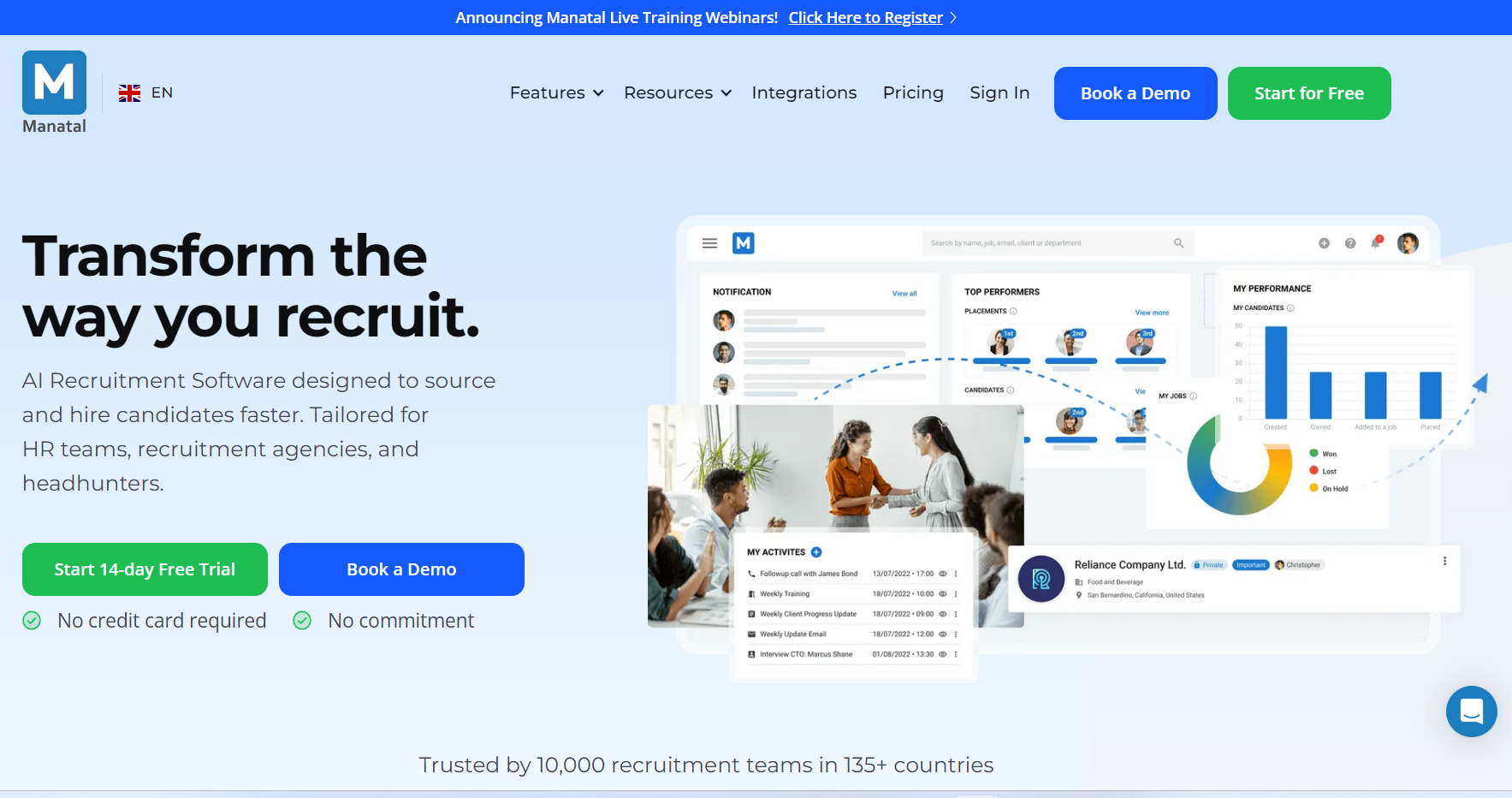 Manatal is a capable recruiting platform designed to accommodate users throughout the hiring pipeline by streamlining and automating processes like resume parsing or candidate assessment. What makes Manatal stand out is the fact that it can be integrated with other recruiting platforms, allowing you to save time and effort by managing all your hiring activities in one place. It also offers a user-friendly interface, customizable workflows, and advanced reporting tools.