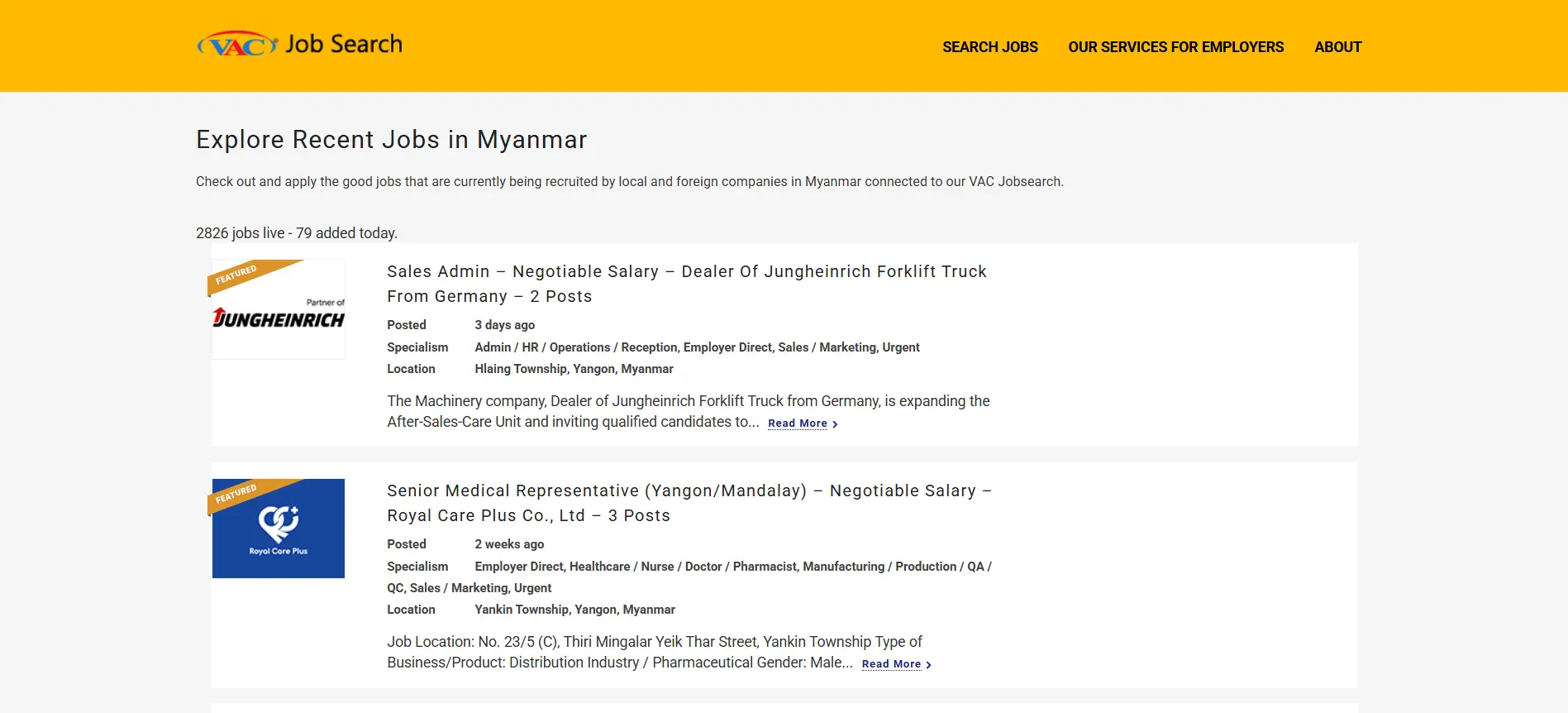 VAC Job Search is a dedicated platform for finding and recruiting top talent in Myanmar, offering comprehensive job posting and search features tailored to the local market. The site connects employers with qualified candidates across industries, emphasizing user-friendly navigation and efficient recruitment tools. With options to post vacancies and review applications seamlessly, VAC Job Search enables recruiters to quickly identify suitable candidates. Its focus on local job seekers makes it an ideal choice for companies looking to build a workforce familiar with Myanmar's business environment and culture.