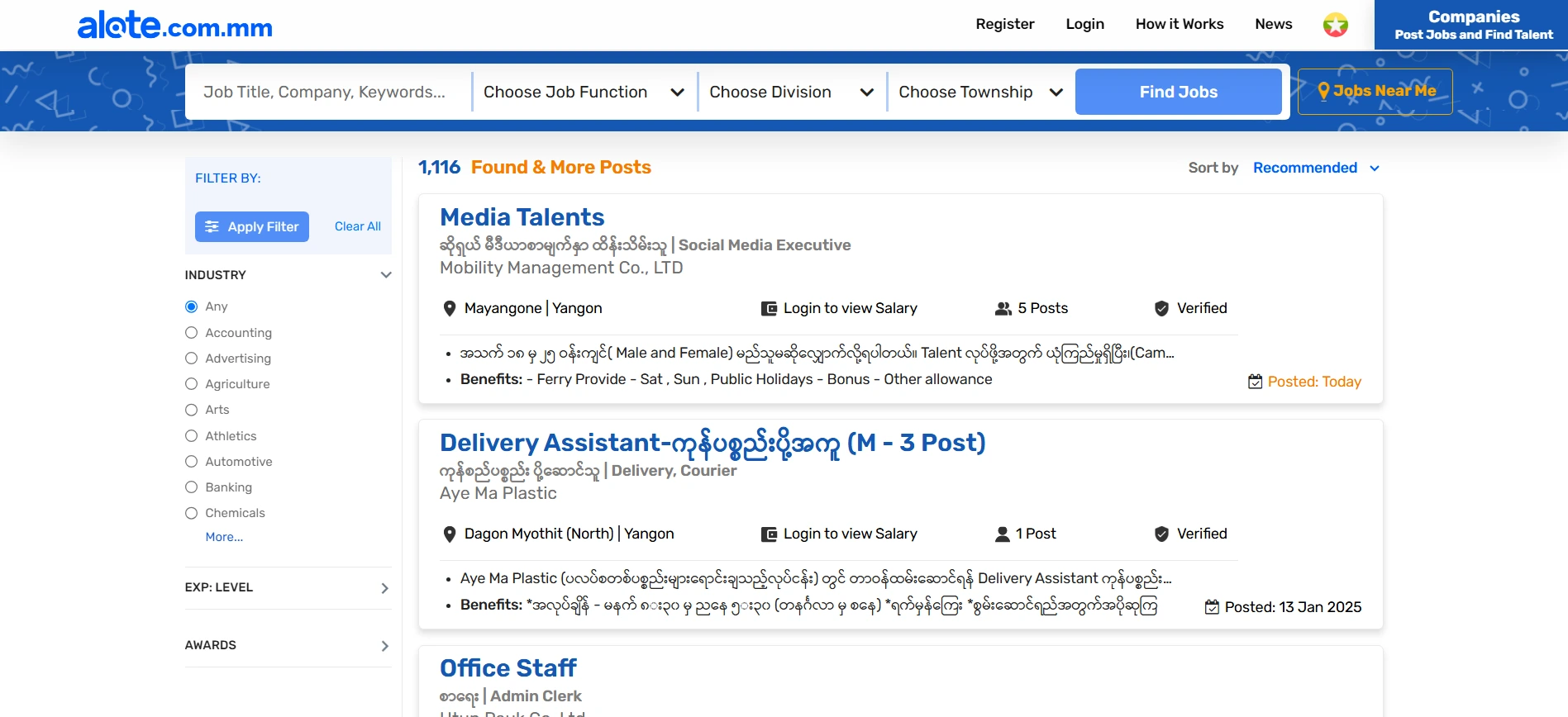 Alote Myanmar differentiates itself as a mobile-first job search platform. It aggregates job listings from leading companies and organizes them into a sleek, easy-to-navigate mobile application, perfect for reaching on-the-go job seekers.