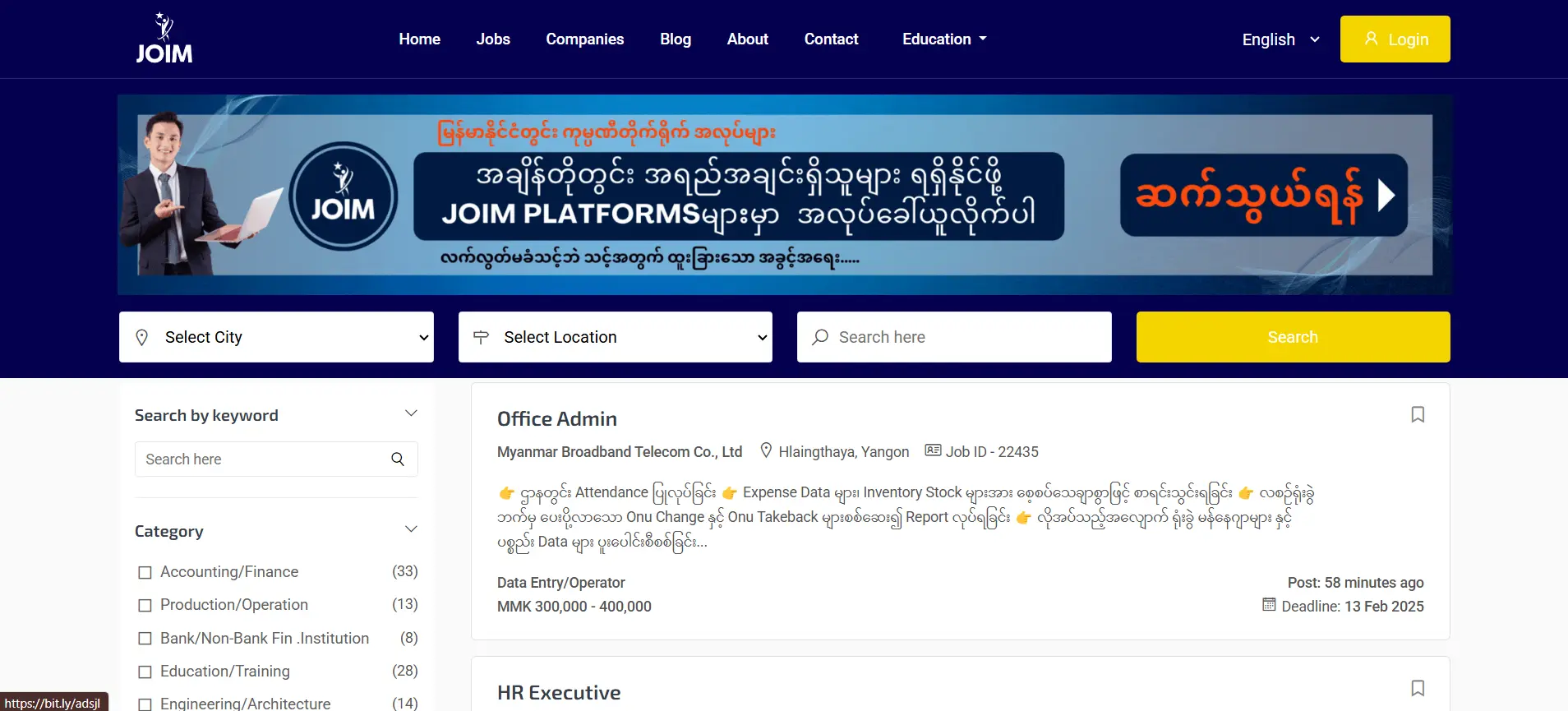 JOIM is a specialized job portal in Myanmar designed to connect employers with a diverse pool of talented professionals across various industries. With its user-friendly interface and targeted job posting features, JOIM simplifies the recruitment process by enabling employers to post vacancies, search for candidates, and review applications efficiently. The platform’s focus on local talent ensures that recruiters can source candidates with in-depth knowledge of the Myanmar market and cultural landscape. Whether you're hiring for entry-level roles or senior positions, JOIM provides the tools to help you identify, engage, and recruit top talent effectively.