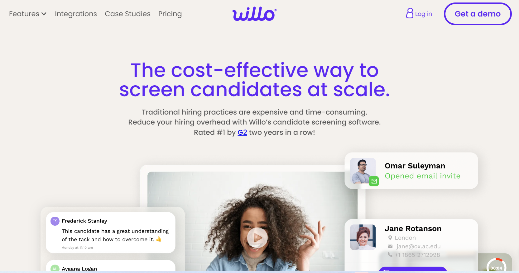 Willo is used for conducting video interviews with candidates, allowing HR personnel, hiring managers, and recruiters to screen and assess candidates from anywhere in the world. It offers features such as pre-recorded and live video interviews, AI-powered assessments, and integrations with applicant tracking systems (ATS) to help you find the best candidates for your open positions.